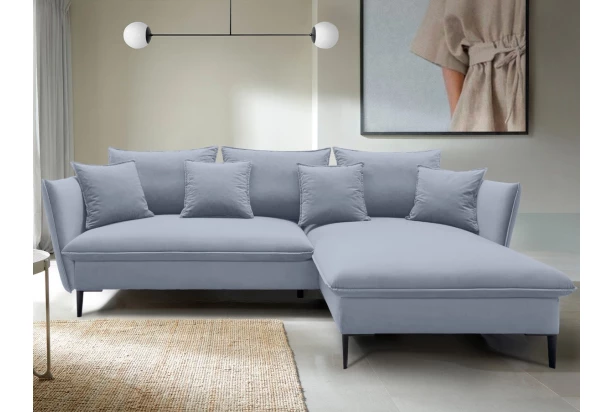 Elegantní rohová sedačka v trendy stylu zajistí příjemné pohodlí v prostoru malého i velkého obýváku. Kvalitně vypolstrované sezení, velké polštáře a relaxační otoman pro váš každodenní komfort. Očalouněna odolnou látkou v barvě světlá šedo-modrá. Tato sedací souprava s bočním otomanem vytváří pravý roh a je vybavena rozkládací funkcí pro příležitostné spaní. Součástí je i úložný prostor, kam lze ukládat polštáře, deky nebo cokoliv, co zrovna nepotřebujete. Pod stabilní kovové nohy se dostane i robotický vysavač, který je často pomocníkem dnešních moderních domácností.
