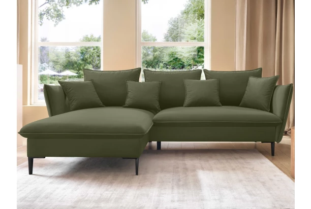 Elegantní rohová sedačka v trendy stylu zajistí příjemné pohodlí v prostoru malého i velkého obýváku. Kvalitně vypolstrované sezení, velké polštáře a relaxační otoman pro váš každodenní komfort. Očalouněna odolnou látkou v barvě špenátová zelená. Tato sedací souprava s bočním otomanem vytváří levý roh a je vybavena rozkládací funkcí pro příležitostné spaní. Součástí je i úložný prostor, kam lze ukládat polštáře, deky nebo cokoliv, co zrovna nepotřebujete. Pod stabilní kovové nohy se dostane i robotický vysavač, který je často pomocníkem dnešních moderních domácností.