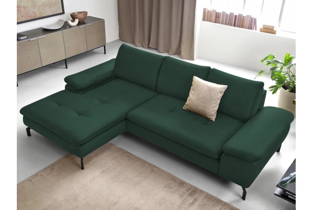 Rohová sedací souprava Vespa na stabilní kovové podnoži působí v interieru vzdušně a rozměrově pasuje i do malého prostoru obýváku. Očalouněna látkou v odstínu lahvově zelená. Pohodlně vypolstrované sedáky a velké polštáře poskytují komfort během každodenního sezení a široký otoman zase prostor pro lenošení. Otoman sedačky vytváří levý roh. Pokud byste chtěli pozvat návštěvu na více dnů, tak skvěle poslouží rozkládací funkce na příležitostné lůžko. Do úložného prostoru pod sedákem můžete ukládat třeba deky, polštáře, vánoční ozdoby anebo například další věci sezónní potřeby.