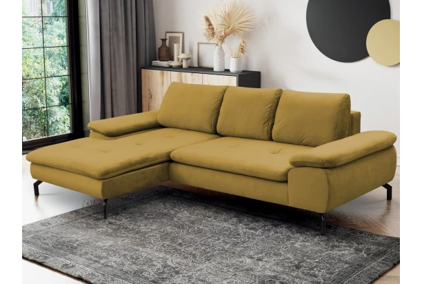 Rohová sedací souprava Vespa na stabilní kovové podnoži působí v interieru vzdušně a rozměrově pasuje i do malého prostoru obýváku. Očalouněna látkou v odstínu hořčicová žlutá. Pohodlně vypolstrované sedáky a velké polštáře poskytují komfort během každodenního sezení a široký otoman zase prostor pro lenošení. Otoman sedačky vytváří levý roh. Pokud byste chtěli pozvat návštěvu na více dnů, tak skvěle poslouží rozkládací funkce na příležitostné lůžko. Do úložného prostoru pod sedákem můžete ukládat třeba deky, polštáře, vánoční ozdoby anebo například další věci sezónní potřeby.