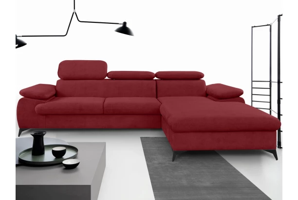 Moderní rohová sedačka Scala poskytuje komfort bez kompromisu v jakkoliv velkém prostoru obýváku. Kromě ideálních rozměrů nabízí komfortně laděné sezení doplněné o zádové opěrky, u kterých si můžete nastavovat sklon a přizpůsobit si tak pohodlí podle sebe. V případě relaxace využijete prostorný otoman, který u sedačky vytváří pravý roh. Očalouněna látkou s příjemně měkkou strukturou v odstínu červená. Sedací souprava je také vybavena úložným prostorem – snadno přístupný z přední strany otomanu. Černé kovové nohy poskytují stabilitu a díky jejich správné výšce lze pod sedačkou použít i robotický vysavač. Tato nadčasová sedačka je prostě přizpůsobena standardům dnešní doby.