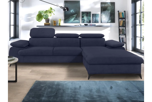 Moderní rohová sedačka Scala poskytuje komfort bez kompromisu v jakkoliv velkém prostoru obýváku. Kromě ideálních rozměrů nabízí komfortně laděné sezení doplněné o zádové opěrky, u kterých si můžete nastavovat sklon a přizpůsobit si tak pohodlí podle sebe. V případě relaxace využijete prostorný otoman, který u sedačky vytváří pravý roh. Očalouněna látkou s příjemně měkkou strukturou v odstínu tmavě modrá. Sedací souprava je také vybavena úložným prostorem – snadno přístupný z přední strany otomanu. Černé kovové nohy poskytují stabilitu a díky jejich správné výšce lze pod sedačkou použít i robotický vysavač. Tato nadčasová sedačka je prostě přizpůsobena standardům dnešní doby.