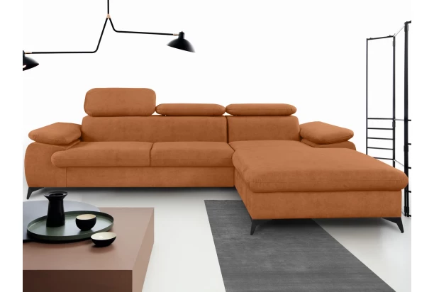 Moderní rohová sedačka Scala poskytuje komfort bez kompromisu v jakkoliv velkém prostoru obýváku. Kromě ideálních rozměrů nabízí komfortně laděné sezení doplněné o zádové opěrky, u kterých si můžete nastavovat sklon a přizpůsobit si tak pohodlí podle sebe. V případě relaxace využijete prostorný otoman, který u sedačky vytváří pravý roh. Očalouněna látkou s příjemně měkkou strukturou v odstínu rezavá. Sedací souprava je také vybavena úložným prostorem – snadno přístupný z přední strany otomanu. Černé kovové nohy poskytují stabilitu a díky jejich správné výšce lze pod sedačkou použít i robotický vysavač. Tato nadčasová sedačka je prostě přizpůsobena standardům dnešní doby.