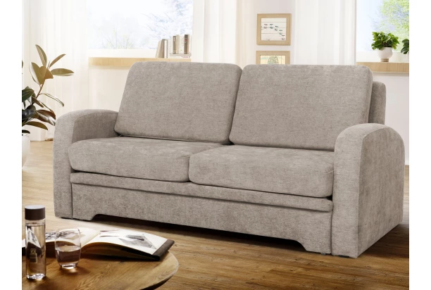 Elegantní pohovka se zaoblenými tvary a polštáři je vybavena úložným prostorem v dolní části a rozkladem na lůžko pro příležitostné i trvalé spaní. Očalouněna příjemnou strukturovanou látkou v odstínu hnědo-béžová.