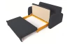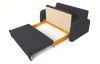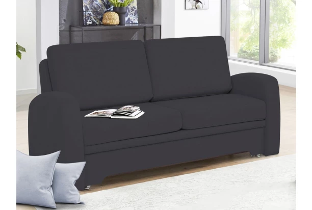 Elegantní pohovka se zaoblenými tvary a polštáři je vybavena úložným prostorem v dolní části a rozkladem na lůžko pro příležitostné i trvalé spaní. Očalouněna velurovou látkou v odstínu tmavě šedá.
