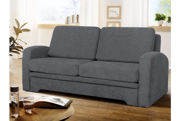Elegantní pohovka se zaoblenými tvary a polštáři je vybavena úložným prostorem v dolní části a rozkladem na lůžko pro příležitostné i trvalé spaní. Očalouněna příjemnou strukturovanou látkou v odstínu středně šedá.