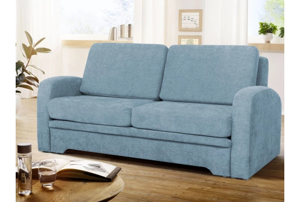 Elegantní pohovka se zaoblenými tvary a polštáři je vybavena úložným prostorem v dolní části a rozkladem na lůžko pro příležitostné i trvalé spaní. Očalouněna příjemnou strukturovanou látkou v odstínu světle modrá.