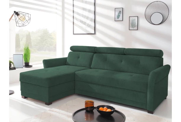 Rohová sedací souprava Harris je ideální volbou do malého prostoru a univerzálním stylem pasuje do každého obýváku. Potažena příjemnou látkou v barvě zelená, pohodlné vypolstrování doplňují polohovatelné opěrky pro individuální nastavení komfortu. S bočním otomanem tvoří sedačka levý roh. Úložný prostor a rozklad na lůžko plní praktickou roli, lůžko můžete využít také pro trvalé spaní.