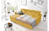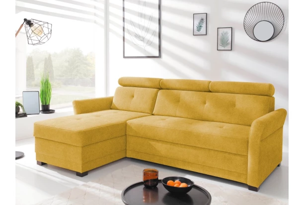 Rohová sedací souprava Harris je ideální volbou do malého prostoru a univerzálním stylem pasuje do každého obýváku. Potažena příjemnou látkou v barvě žlutá, pohodlné vypolstrování doplňují polohovatelné opěrky pro individuální nastavení komfortu. S bočním otomanem tvoří sedačka levý roh. Úložný prostor a rozklad na lůžko plní praktickou roli, lůžko můžete využít také pro trvalé spaní.