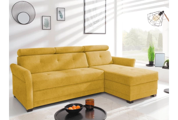 Rohová sedací souprava Harris je ideální volbou do malého prostoru a univerzálním stylem pasuje do každého obýváku. Potažena příjemnou látkou v barvě žlutá, pohodlné vypolstrování doplňují polohovatelné opěrky pro individuální nastavení komfortu. S bočním otomanem tvoří sedačka pravý roh. Úložný prostor a rozklad na lůžko plní praktickou roli, lůžko můžete využít také pro trvalé spaní.