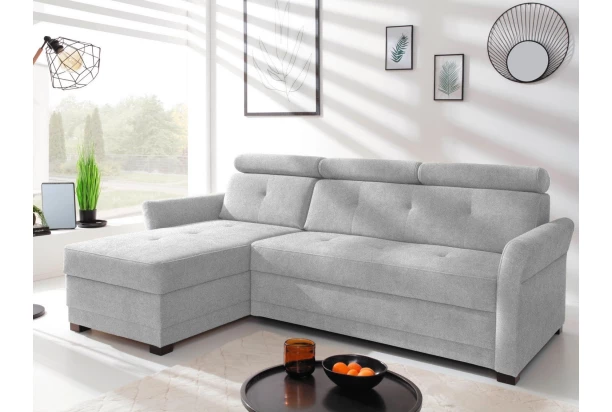 Rohová sedací souprava Harris je ideální volbou do malého prostoru a univerzálním stylem pasuje do každého obýváku. Potažena příjemnou látkou v barvě světle šedá, pohodlné vypolstrování doplňují polohovatelné opěrky pro individuální nastavení komfortu. S bočním otomanem tvoří sedačka levý roh. Úložný prostor a rozklad na lůžko plní praktickou roli, lůžko můžete využít také pro trvalé spaní.