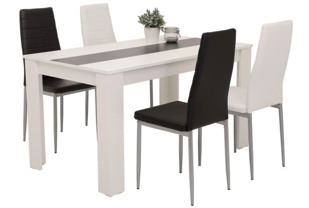 Jídelní set pro klasicky početnou rodinu obsahuje 5 dílů – obdélný jídelní stůl a čtyři židle. Černo-bílé provedení jídelní sestavy je nadčasové a bude se hodit do každé kuchyně, jídelny nebo obývacího prostoru. Středová plocha jídelního stolu je navíc oboustranná – můžete si tak snadno během montáže sami vybrat, zda chcete použít kontrastně černou stranu anebo klasicky bílou – záleží jen na vašem vkusu, což je skvělé.