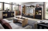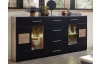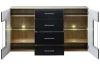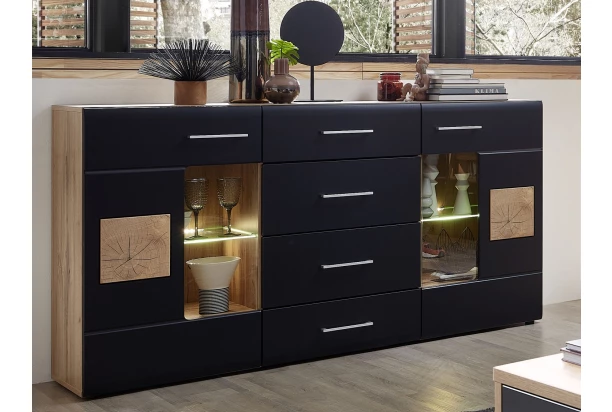 Moderní černá široká komoda s osvětlením v kombinaci s dubovým dřevodekorem pro příjemný domov inspirovaný přírodou. Stylové aplikace s optikou rozpraskaného dřeva vytváří skvělý kontrast a zaujmou na pohled.