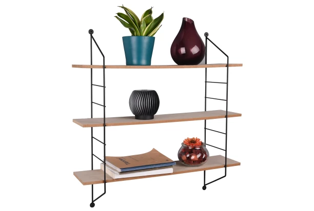 Elegantní závěsný regál má pevný černý kovový rám a 3 police z přírodního dřeva, které nabídnou dostatek prostoru pro Vaše oblíbené dekorace a další bytové doplňky. Nástěnná police má moderní nadčasový design, který lze snadno začlenit do jakéhokoli stylu bydlení.