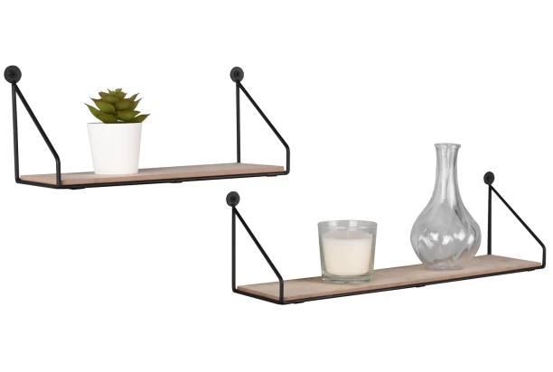Set 2 ks police z černého kovu a přírodního dřeva stylově ozdobí Vaše stěny nad pohovkou, postelí, ve vstupním prostoru, předsíni nebo kdekoliv jinde. Nástěnné poličky mají moderní nadčasový design, který se hodí do interiéru ve skandinávském nebo industriálním stylu. Menší a větší police mohou tvořit společnou působivou kompozici anebo být rozmístěny kdekoliv samostatně.