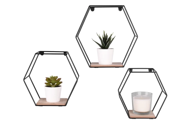 Set 3 ks nástěnná police Sarah, černý kov/dřevo, hexagon