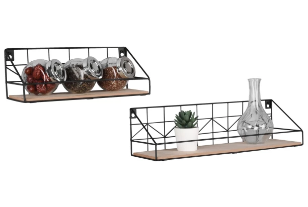 Set 2 ks police z černého kovu a přírodního dřeva stylově ozdobí Vaše stěny nad pohovkou, postelí, ve vstupním prostoru, předsíni nebo kdekoliv jinde. Nástěnné poličky mají moderní nadčasový design, který se hodí do interiéru ve skandinávském nebo industriálním stylu. Menší a větší police mohou tvořit společnou působivou kompozici anebo být rozmístěny kdekoliv samostatně.