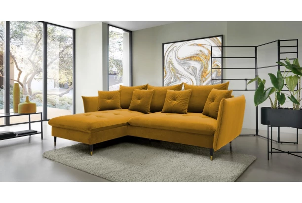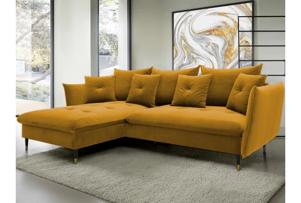 Rohová sedací souprava v elegantním glamour stylu působí pohodlně – a to nejen na pohled, pohodlná totiž opravdu je. Příjemně vypolstrované sezení, velké polštáře a relaxační otoman si snadno oblíbíte. Očalouněna látkou sametového vzhledu v odstínu tmavě žlutá. Elegantní design navíc podtrhují stabilní černo-zlaté kovové nohy, pod které se snadno dostane třeba i váš robotický vysavač. Provedení sedačky s otomanem vytváří levý roh. Pod sedákem je ukrytý praktický ukládací prostor a sedačku lze využít i pro příležitostné spaní díky rozkládací funkci. Svými rozměry snadno pasuje do téměř každého rohu obýváku, kde vytvoří útulné domácí prostředí.
