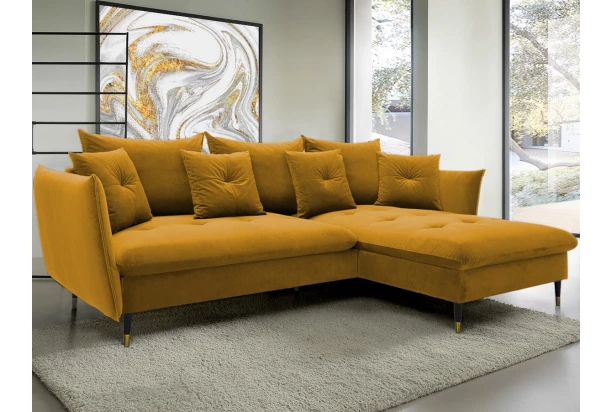 Rohová sedací souprava v elegantním glamour stylu působí pohodlně – a to nejen na pohled, pohodlná totiž opravdu je. Příjemně vypolstrované sezení, velké polštáře a relaxační otoman si snadno oblíbíte. Očalouněna látkou sametového vzhledu v odstínu tmavě žlutá. Elegantní design navíc podtrhují stabilní černo-zlaté kovové nohy, pod které se snadno dostane třeba i váš robotický vysavač. Provedení sedačky s otomanem vytváří pravý roh. Pod sedákem je ukrytý praktický ukládací prostor a sedačku lze využít i pro příležitostné spaní díky rozkládací funkci. Svými rozměry snadno pasuje do téměř každého rohu obýváku, kde vytvoří útulné domácí prostředí.
