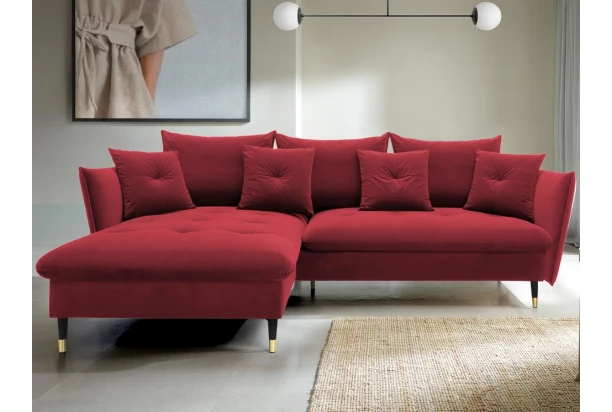 Rohová sedací souprava v elegantním glamour stylu působí pohodlně – a to nejen na pohled, pohodlná totiž opravdu je. Příjemně vypolstrované sezení, velké polštáře a relaxační otoman si snadno oblíbíte. Očalouněna látkou sametového vzhledu v odstínu rubínově červená. Elegantní design navíc podtrhují stabilní černo-zlaté kovové nohy, pod které se snadno dostane třeba i váš robotický vysavač. Provedení sedačky s otomanem vytváří levý roh. Pod sedákem je ukrytý praktický ukládací prostor a sedačku lze využít i pro příležitostné spaní díky rozkládací funkci. Svými rozměry snadno pasuje do téměř každého rohu obýváku, kde vytvoří útulné domácí prostředí.