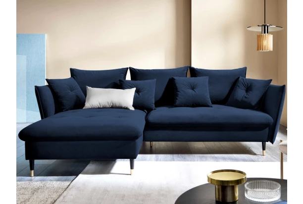 Rohová sedací souprava v elegantním glamour stylu působí pohodlně – a to nejen na pohled, pohodlná totiž opravdu je. Příjemně vypolstrované sezení, velké polštáře a relaxační otoman si snadno oblíbíte. Očalouněna látkou sametového vzhledu v odstínu královská modrá. Elegantní design navíc podtrhují stabilní černo-zlaté kovové nohy, pod které se snadno dostane třeba i váš robotický vysavač. Provedení sedačky s otomanem vytváří levý roh. Pod sedákem je ukrytý praktický ukládací prostor a sedačku lze využít i pro příležitostné spaní díky rozkládací funkci. Svými rozměry snadno pasuje do téměř každého rohu obýváku, kde vytvoří útulné domácí prostředí.