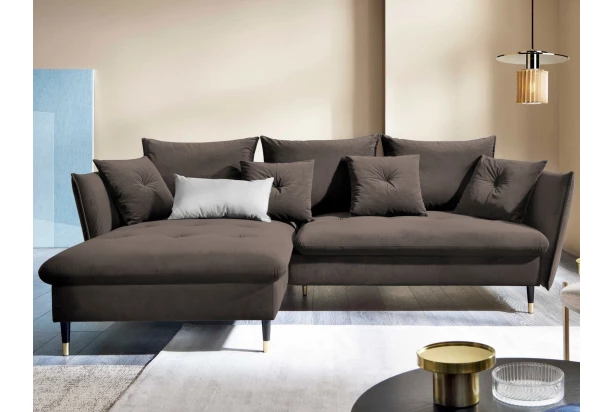 Rohová sedací souprava v elegantním glamour stylu působí pohodlně – a to nejen na pohled, pohodlná totiž opravdu je. Příjemně vypolstrované sezení, velké polštáře a relaxační otoman si snadno oblíbíte. Očalouněna látkou sametového vzhledu v odstínu hnědá. Elegantní design navíc podtrhují stabilní černo-zlaté kovové nohy, pod které se snadno dostane třeba i váš robotický vysavač. Provedení sedačky s otomanem vytváří levý roh. Pod sedákem je ukrytý praktický ukládací prostor a sedačku lze využít i pro příležitostné spaní díky rozkládací funkci. Svými rozměry snadno pasuje do téměř každého rohu obýváku, kde vytvoří útulné domácí prostředí.