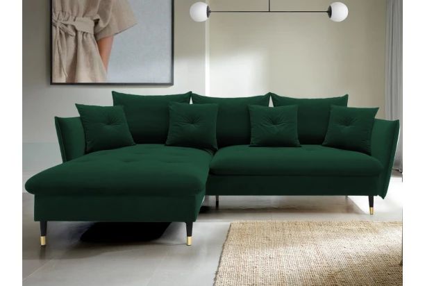 Rohová sedací souprava v elegantním glamour stylu působí pohodlně – a to nejen na pohled, pohodlná totiž opravdu je. Příjemně vypolstrované sezení, velké polštáře a relaxační otoman si snadno oblíbíte. Očalouněna látkou sametového vzhledu v odstínu tmavě zelená. Elegantní design navíc podtrhují stabilní černo-zlaté kovové nohy, pod které se snadno dostane třeba i váš robotický vysavač. Provedení sedačky s otomanem vytváří levý roh. Pod sedákem je ukrytý praktický ukládací prostor a sedačku lze využít i pro příležitostné spaní díky rozkládací funkci. Svými rozměry snadno pasuje do téměř každého rohu obýváku, kde vytvoří útulné domácí prostředí.