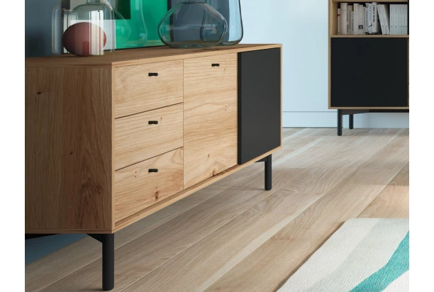 Široká komoda se zásuvkami z kolekce Flow – jednoduše moderní a funkční design nábytku skvěle doplní nadčasový styl vašeho bydlení. Kombinaci dubu artisan s černými plochami doplňuje zajímavě tvarovaná černá podnož. Díky tomu bude interier působit vzdušně a zároveň umožní snadnou údržbu podlahy.