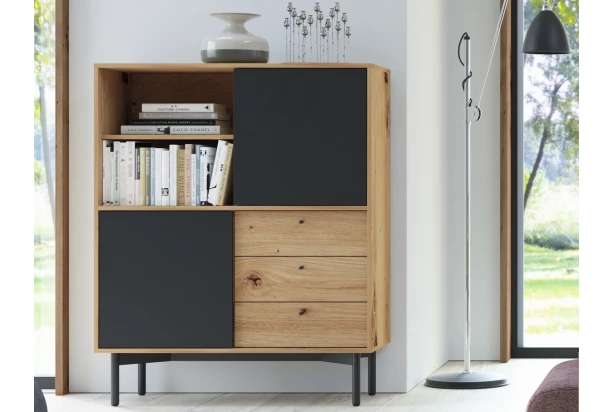 Vysoká skříňka z kolekce Flow – jednoduše moderní a funkční design nábytku skvěle doplní nadčasový styl vašeho bydlení. Kombinaci dubu artisan s černými plochami doplňuje zajímavě tvarovaná černá podnož. Díky tomu bude interier působit vzdušně a zároveň umožní snadnou údržbu podlahy.