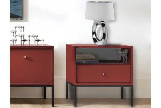 Odkládací/noční stolek se zásuvkou z kolekce Mono v barvě červená – to je moderní elegance s glamour nádechem. Atraktivní design podtrhují zlaté úchytky a černá kovová podnož, díky níž nábytek působí vzdušně a zároveň umožňuje praktickou údržbu podlahy. Nábytek tak doplní stylovou atmosféru vašeho bytu. Stolek lze kombinovat také s dalšími elementy této nábytkové řady, případně může být umístěna v interieru i samostatně jako zajímavý solitér.