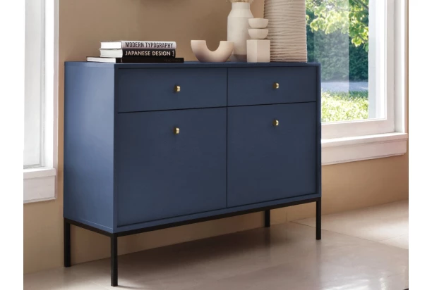 Skříňka se zásuvkami z kolekce Mono v barvě tmavě modrá – to je moderní elegance s glamour nádechem. Atraktivní design podtrhují zlaté úchytky a černá kovová podnož, díky níž nábytek působí vzdušně a zároveň umožňuje praktickou údržbu podlahy. Nábytek tak doplní stylovou atmosféru vašeho bytu. Komodu lze kombinovat také s dalšími elementy této nábytkové řady, případně může být umístěna v interieru i samostatně jako zajímavý solitér.