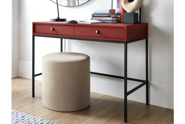 Univerzální nebo psací anebo toaletní stolek z kolekce Mono v barvě červená – to je moderní elegance s glamour nádechem. Atraktivní design podtrhují zlaté úchytky a černá kovová podnož, díky níž nábytek působí vzdušně a zároveň umožňuje praktickou údržbu podlahy. Stolek tak doplní stylovou atmosféru vašeho bytu. Komodu lze kombinovat také s dalšími elementy této nábytkové řady, případně může být umístěna v interieru i samostatně jako zajímavý solitér.