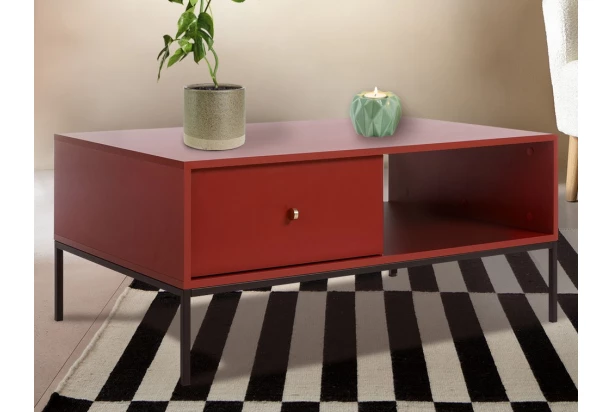 Konferenční stolek se zásuvkami z kolekce Mono v barvě červená – to je moderní elegance s glamour nádechem. Atraktivní design podtrhují zlaté úchytky a černá kovová podnož, díky níž nábytek působí vzdušně a zároveň umožňuje praktickou údržbu podlahy. Nábytek tak doplní stylovou atmosféru vašeho bytu. Stolek lze kombinovat také s dalšími elementy této nábytkové řady, případně může být umístěn v interieru i samostatně jako zajímavý solitér.