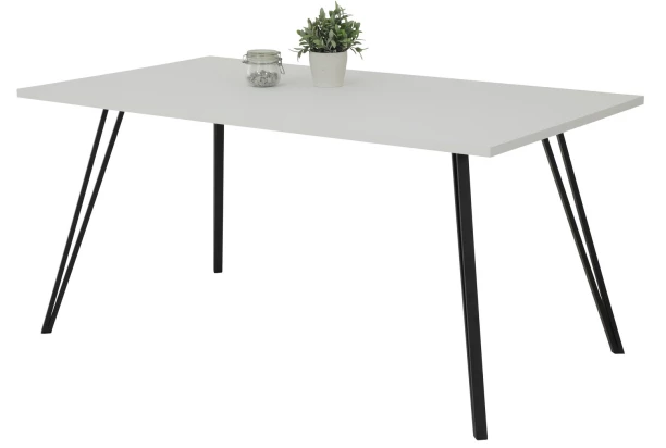 Obdélný jídelní stůl na černé kovové podnoži v moderním designu. Obdélná jídelní deska o ploše 160×90 cm má bílý povrch v matném provedení.