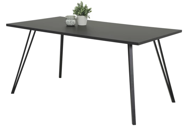 Obdélný jídelní stůl na černé kovové podnoži v moderním designu. Obdélná jídelní deska o ploše 160×90 cm má černý povrch v matném provedení.
