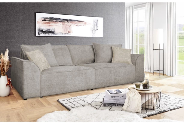 Velká komfortní pohovka s různě velkými polštáři vytvoří příjemné relaxační prostředí ve vašem obýváku. Očalouněna měkoučkou látkou s delším strukturovaným vlasem v odstínu béžová cappuccino, která doplní útulnou atmosféru bytu. Po odejmutí polštářů můžete získat dostatečný prostor pro příležitostné přespání třeba vaší návštěvy. Pohovku můžete umístit nejen přímo ke stěně, ale skvěle vynikne i v prostoru obýváku. Doplněna malými polštáři v barvě světle béžová.