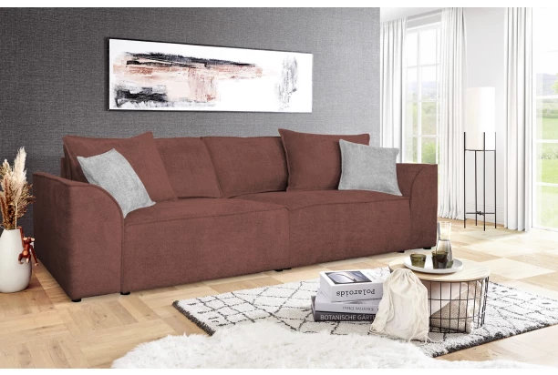 Velká komfortní pohovka s různě velkými polštáři vytvoří příjemné relaxační prostředí ve vašem obýváku. Očalouněna měkoučkou látkou s delším strukturovaným vlasem v odstínu měděná, která doplní útulnou atmosféru bytu. Po odejmutí polštářů můžete získat dostatečný prostor pro příležitostné přespání třeba vaší návštěvy. Pohovku můžete umístit nejen přímo ke stěně, ale skvěle vynikne i v prostoru obýváku. Doplněna malými polštáři v barvě světle šedá.