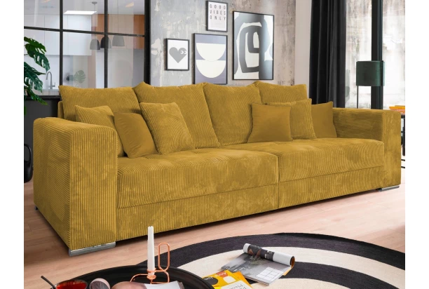 Široká pohovka s velkými polštáři nabízí ideální prostor pro skvělou domácí pohodu. Na útulnosti přidává i měkoučká potahová látka s proužkovanou strukturou v odstínu hořčicová žlutá. Prostorná pohovka tak vytvoří útulný středobod vašeho obýváku. Může být umístěna ke stěně anebo také doprostřed místnosti, kde vynikne. Po odejmutí polštářů může nabídnout i dostatečný prostor pro přespání návštěvy. Tato velká pohovka v moderním nadčasovém stylu se hodí jak do bytu, tak i do rodinného domu.