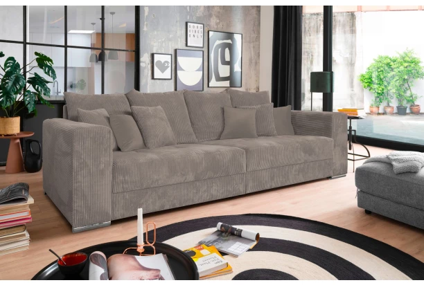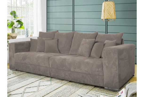 Široká pohovka s velkými polštáři nabízí ideální prostor pro skvělou domácí pohodu. Na útulnosti přidává i měkoučká potahová látka s proužkovanou strukturou v odstínu béžová taupe. Prostorná pohovka tak vytvoří útulný středobod vašeho obýváku. Může být umístěna ke stěně anebo také doprostřed místnosti, kde vynikne. Po odejmutí polštářů může nabídnout i dostatečný prostor pro přespání návštěvy. Tato velká pohovka v moderním nadčasovém stylu se hodí jak do bytu, tak i do rodinného domu.