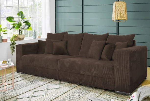 Široká pohovka s velkými polštáři nabízí ideální prostor pro skvělou domácí pohodu. Na útulnosti přidává i měkoučká potahová látka s proužkovanou strukturou v odstínu hnědá. Prostorná pohovka tak vytvoří útulný středobod vašeho obýváku. Může být umístěna ke stěně anebo také doprostřed místnosti, kde vynikne. Po odejmutí polštářů může nabídnout i dostatečný prostor pro přespání návštěvy. Tato velká pohovka v moderním nadčasovém stylu se hodí jak do bytu, tak i do rodinného domu.