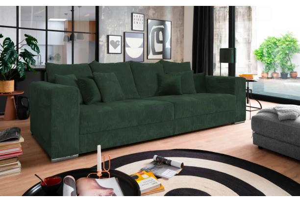 Široká pohovka s velkými polštáři nabízí ideální prostor pro skvělou domácí pohodu. Na útulnosti přidává i měkoučká potahová látka s proužkovanou strukturou v odstínu lahvově zelená. Prostorná pohovka tak vytvoří útulný středobod vašeho obýváku. Může být umístěna ke stěně anebo také doprostřed místnosti, kde vynikne. Po odejmutí polštářů může nabídnout i dostatečný prostor pro přespání návštěvy. Tato velká pohovka v moderním nadčasovém stylu se hodí jak do bytu, tak i do rodinného domu.