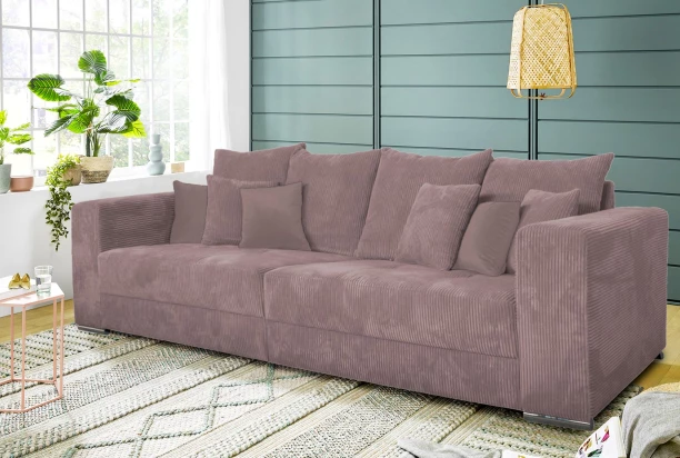 Široká pohovka s velkými polštáři nabízí ideální prostor pro skvělou domácí pohodu. Na útulnosti přidává i měkoučká potahová látka s proužkovanou strukturou v odstínu světle růžová. Prostorná pohovka tak vytvoří útulný středobod vašeho obýváku. Může být umístěna ke stěně anebo také doprostřed místnosti, kde vynikne. Po odejmutí polštářů může nabídnout i dostatečný prostor pro přespání návštěvy. Tato velká pohovka v moderním nadčasovém stylu se hodí jak do bytu, tak i do rodinného domu.