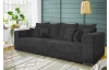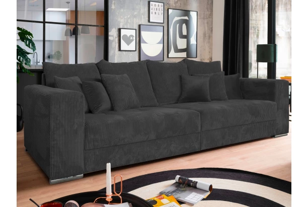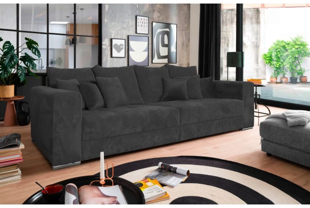 Široká pohovka s velkými polštáři nabízí ideální prostor pro skvělou domácí pohodu. Na útulnosti přidává i měkoučká potahová látka s proužkovanou strukturou v odstínu antracitová šedá. Prostorná pohovka tak vytvoří útulný středobod vašeho obýváku. Může být umístěna ke stěně anebo také doprostřed místnosti, kde vynikne. Po odejmutí polštářů může nabídnout i dostatečný prostor pro přespání návštěvy. Tato velká pohovka v moderním nadčasovém stylu se hodí jak do bytu, tak i do rodinného domu.