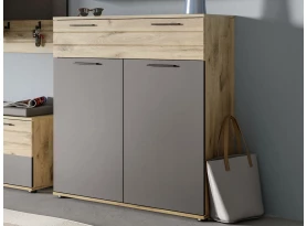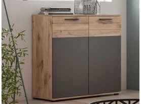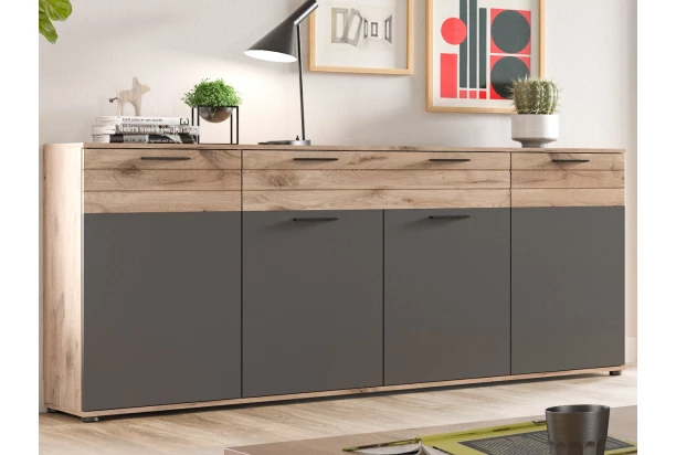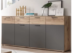 Široká komoda se zásuvkou z kolekce Mason – moderní a praktický nábytek v kombinaci dubového dřevodekoru a šedých ploch ozvláštňují horizontálně frézované linie, které dodávají nábytku zajímavý efekt. Moderní design a vysoce kvalitní zpracování z ní činí funkční a esteticky příjemný kus nábytku do vašeho domácího prostředí.