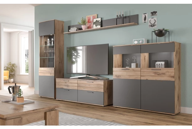 Skříňka s prosklením z kolekce Mason – moderní a praktický nábytek v kombinaci dubového dřevodekoru a šedých ploch ozvláštňují horizontálně frézované linie, které dodávají nábytku zajímavý efekt. Moderní design a vysoce kvalitní zpracování z ní činí funkční a esteticky příjemný kus nábytku do vašeho domácího prostředí.
