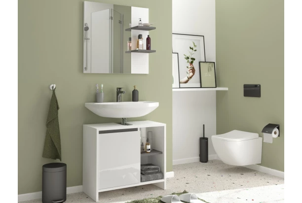 Koupelnová sestava obsahuje skříňku pod umyvadlo a zrcadlový panel spoličkami. Tento koupelnový nábytek je ideální také do malého prostoru koupelny. Vyroben v kombinaci bílá/šedá.