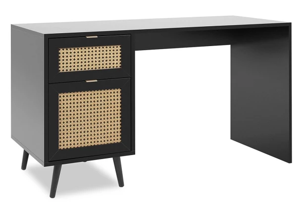 Psací stůl z kolekce Vienna – elegantní nábytek v černém provedení v kombinaci s imitací přírodního vídeňského výpletu zaujme na pohled a skvěle doplní váš stylový interier. Masivní černé nožky dotváří elegantní vzhled a zároveň umožňují snadnou údržbu podlahy. Objevte tak kouzlo nábytku s tradičním nádechem, který působí útulně, velmi stylově a zároveň zůstává praktický. Z jednolivých elementů tak můžete krásně zařídit prostor celého bytu. Tento nábytek se dobře kombinuje také s přírodními doplňky, navíc úžasně doplní i moderní interier, kde vynikne a stane se zajímavým vizuálním prvkem.