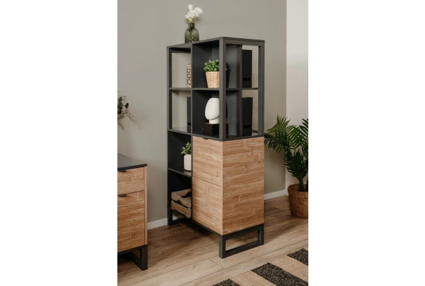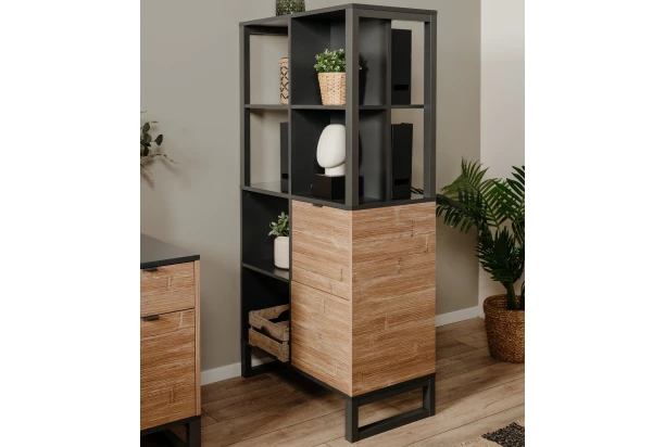 Vysoký úložný regál z kolekce Sumatra – moderní design nábytku zvýrazňují kontrastní antracitové plochy v kombinaci s hnědými tóny bambusového dřevodekoru, u kterého zaujme strukturovaná optika. Nábytek působí zajímavě, moderně a přitom velmi útulně. Tmavá antracitová podnož vytváří odlehčený efekt a zároveň celkově dotváří moderní trendový design. Regál je možné umístit ke stěně z jakékoliv strany a vytvořit tak i optický předěl místnosti.