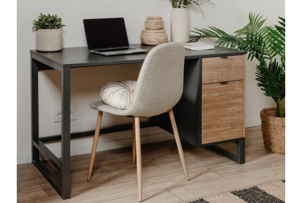 Psací stůl z kolekce Sumatra – moderní design nábytku zvýrazňují kontrastní antracitové plochy v kombinaci s hnědými tóny bambusového dřevodekoru, u kterého zaujme strukturovaná optika. Nábytek působí zajímavě, moderně a přitom velmi útulně. Tmavá antracitová podnož vytváří odlehčený efekt a zároveň celkově dotváří moderní trendový design.