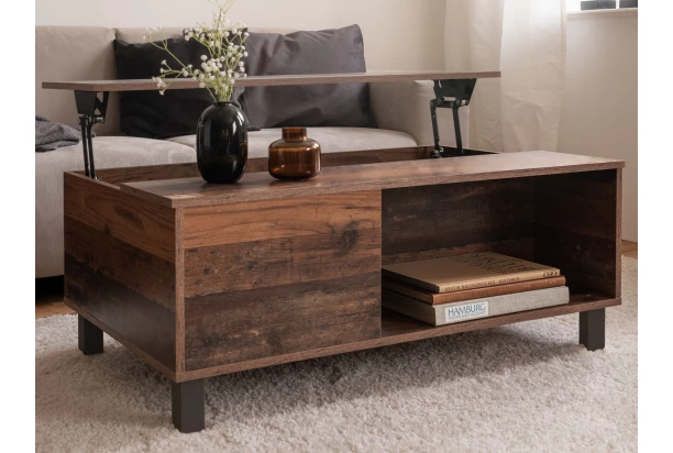Tento konferenční stolek ve vintage optice dřeva překvapí svou praktičností. Pod výklopnou horní plochou najdete vnitřní úložné prostory, kam snadno uschováte věci každodenní potřeby, případně knížky nebo časopisy. Oceníte i otevřenou odkládací přihrádku z boční strany stolku, do které budete odkládat třeba dálkové ovladače. S tímto stolkem tak budete mít vše přehledně uloženo na stejném místě a zároveň vždy ihned při ruce.